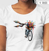 Resgate as doces memórias e a alegria das coisas simples com a nossa camiseta 'Passeio Florido', mais uma peça encantadora da coleção 'Arte e Inspiração'. Esta estampa é uma celebração dos dias ensolarados, capturando a beleza de uma bicicleta retrô cuja cesta transborda com a exuberância de flores coloridas. O lenço esvoaçante no guidão dá um toque de movimento e liberdade, convidando você a pedalar por caminhos cheios de cor e perfume. Confeccionada com a suavidade única do nosso algodão premium, esta camiseta garante conforto absoluto e um caimento perfeito para acompanhar seus melhores momentos. Vista-se com esta obra de arte e carregue no peito a inspiração de um dia leve, feliz e cheio de poesia. Porque a vida, afinal, é um belo passeio.